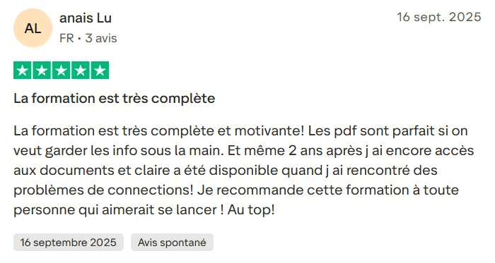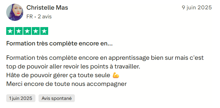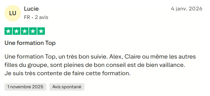 ✅ Tu n’es jamais seule, grâce à la formation en ligne + le groupe WhatsApp, où tu peux poser tes questions, avancer plus vite et rester motivée jusqu’au bout.